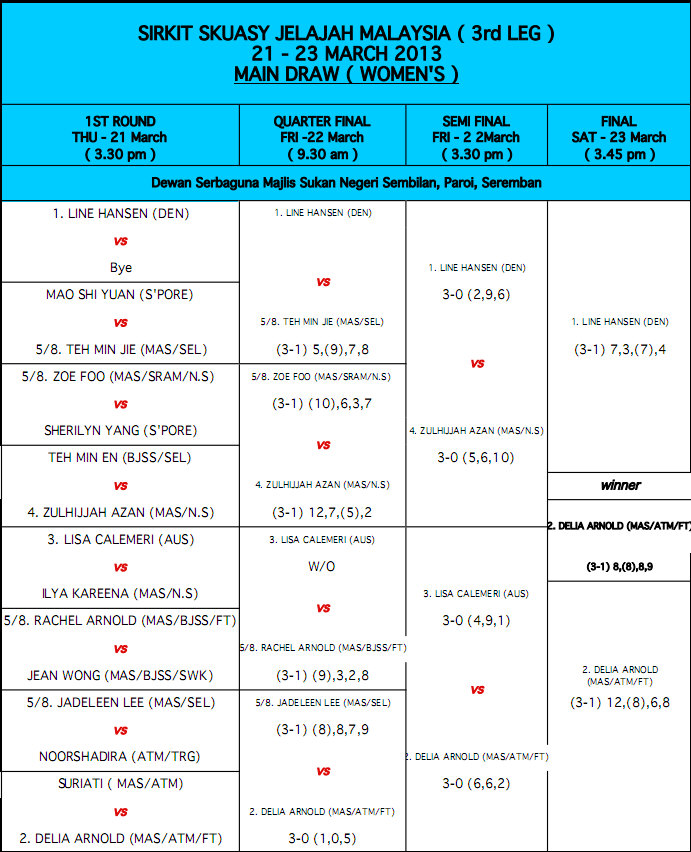 Delia Arnold (Mas) bt Line Hansen (Den) 11/8, 8/11, 11/8, 11/9