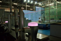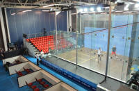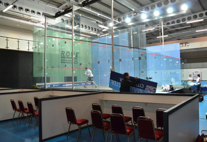 court area inside the National Squash Centre, with boxes