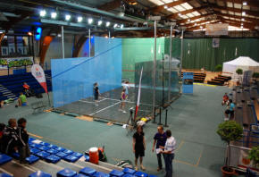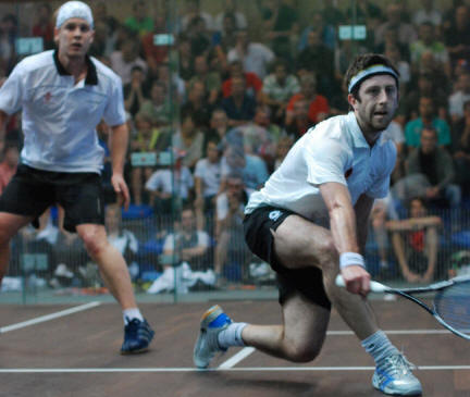 number two Nick Matthew on the glass court in front of a large