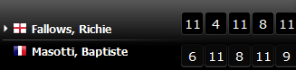 Baptiste Masotti 3-1 Toon Van Baekel 11-8 11-5