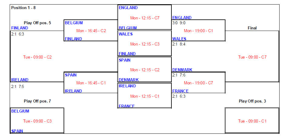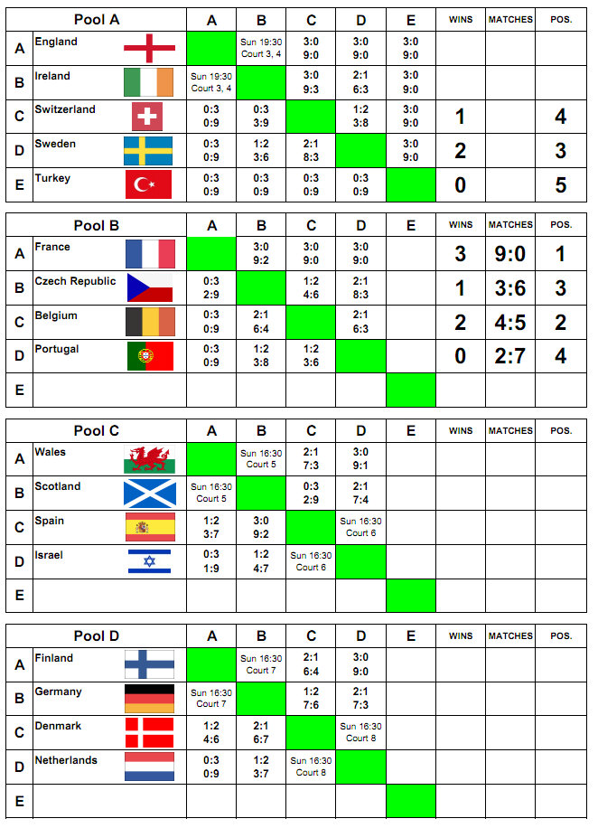 Demi-finale France 3-0 Danemark Mathias Grondin bat Casper Kloster 11/8, 11/5, 11/3 Adrien Grondin bat Jens Christian Wegeberg 11/7, 11/5, 12/10 Marion Andriamifidy bat Matilde Lauridsen 2/0