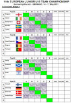 Adrien Grondin perd Adam Turner 12/10, 11/5, 10/12, 6/11, 11/6 Marion Andriamifidy v Lucy Beecroft 12/10, 15/13, 6/11, 11/4 Mathias Grondin perd James Peach 11/7, 11/7 U17 Place 9/10 France 2-1 Espagne Marie Stephan bat Marina Lopez 11/4, 11/6, 11/4 Baptiste Mazotti perd David Antolin 11/9, 11/2, 12/10 Antoine Poulain bat Ilet Pakares 12/10, 5/11, 19/17, 11/5 |
