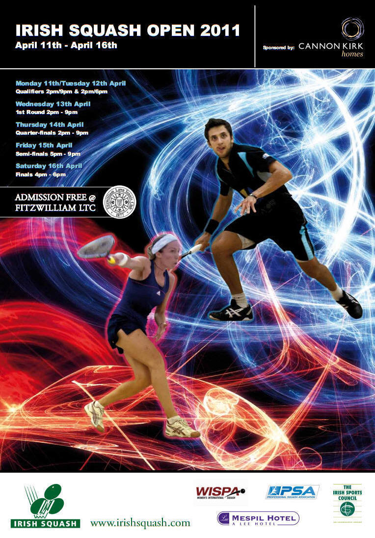 Irish Open 2011 11-16 Apr, Dublin, $25k | Round One 13 Apr | Quarters 14 Apr | Semis 15 Apr | Final 16 Apr | [1] Stewart Boswell (Aus) 4/11, 11/5, 11/5, 11/4 (44m) Nicolas Mueller (Sui) | [1] Stewart Boswell 11/5, 11/4, 8/11, 4/11, 11/2 (60m) Chris Ryder | [1] Stewart Boswell 6/11, 11/4, 11/7, 11/5 (58m) Borja Golan | [1] Stewart Boswell 12/10, 11/7, 8/11, 11/3 (54m) Tarek Momen | Chris Ryder (Eng) 11/9, 11/6, 11/7 (69m) Alan Clyne (Sco) | Mathieu Castagnet (Fra) 9/11, 11/7, 6/11, 11/7, 11/7 (88m) [Q] Grégoire Marche (Fra) | Mathieu Castagnet 11/9, 11/8, 11/1 (47m)Borja Golan | Borja Golan (Esp) 11/6, 11/7, 11/9 (60 mins) [4] Ali Anwar Reda (Egy) | [3] Saurav Ghosal (Ind) 11/8, 12/10, 11/3 (35m) [Q] Henrik Mustonen (Fin) | [3] Saurav Ghosal 11/4, 11/6, 11/7 (44m) [Q] Siddarth Suchde | [3] Saurav Ghosal 8/11, 2/11, 12/10 rtd (57m) Tarek Momen | [Q] Matthew Karwalski (Aus) 11/4, 12/10, 11/6 (44m) [Q] Siddarth Suchde (Ind) | Tarek Momen (Egy) 12/10, 11/7,11/6 (37m) Campbell Grayson (Nzl) | Tarek Momen 11/3, 8/11, 11/6, 11/4 [2] Olli Tuominen | Chris Simpson (Eng) 11/4, 11/7, 11/8 (32 mins) [2] Olli Tuominen (Fin) |