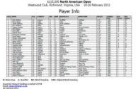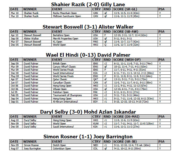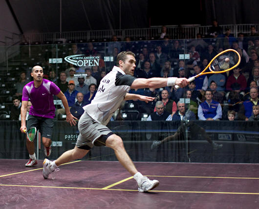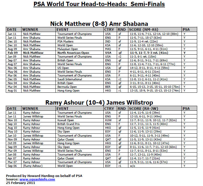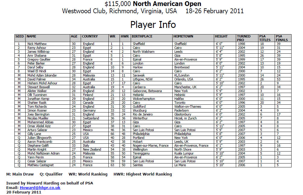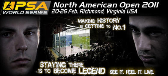 North American Open 2011 18-26 Feb, Richmond, Virginia, Usa, $115k | Round One 20/21 Feb | Round One 22/23 Feb | Quarters 24 Feb | Semis 25 Feb | Final 26 Feb | [1] Nick Matthew (Eng) 9-11, 11-6, 11-6, 11-7 (49mn) [Q] Julian Illingworth (Usa) | [1] Nick Matthew 11/7, 11/4, 11/8 (34m) Shahier Razik | [1] Nick Matthew 8/9 rtd (23m) David Palmer | [1] Nick Matthew 18.00 [4] Amr Shabana | 17.00 | Shahier Razik (Can) 12-10, 11-7, 11-7 (59mn) Gilly Lane (Usa) | Stewart Boswell (Aus) 12-10, 11-9, 5-11, 11-4 (64mn) Alister Walker (Eng) | Alister Walker 11/6, 3/11, 11/6, 11/9 (61m) David Palmer | David Palmer (Aus) 11-2, 11-8, 11-7 (40mn) [8] Wael El Hindi (Egy) | [7] Daryl Selby (Eng) 9-11, 11-4, 11-3, 11-5 (60mn) Azlan Iskandar (Mas) | Azlan Iskandar 9/11, 11/1, 11/5, 11/7 (48m) Simon Rosner | Azlan Iskandar 11/7, 6/11, 12/10, 12/10 (48m) [4] Amr Shabana | Simon Rosner (Ger) 11-3, 11-8, 9-11, 11-5 (48mn) Joey Barrington (Eng) | Jonathan Kemp (Eng) 11-7, 11-5, 11-5 (24mn) [Q] Cesar Salazar (Mex) | Jonathan Kemp 11/8, 13/15, 8/11, 11/7, 11/8 (54m) [4] Amr Shabana | Arturo Salazar (Mex) 11-8, 11-8, 11-5 (29mn) [4] Amr Shabana (Egy) | [3] James Willstrop (Eng) 2/10, 11/6 11/8 (37m) [Q] Yann Perrin (Fra) | [3] James Willstrop 11/7, 11/7, 11/5 (38m) [Q] Martin Knight | [3] James Willstrop 7/11, 11/4, 11/4, 11/5 (49m) [6] Peter Barker | [3] James Willstrop 19.00 [2] Ramy Ashour | [Q] Mathieu Castagnet (Fra) 11/7, 2/11, 11/7, 11/8 (55m) [Q] Martin Knight (Nzl) | [Q] Stephane Galifi (Ita) 6/11, 11/8, 11/5, 6/11, 13/11 (93m) [Q]Nafiizwan Adnan (Mas) | [Q]Nafiizwan Adnan 11/2, 11/3, 11/5 (26m) [6] Peter Barker | Omar Abdel Aziz (Egy) 11/2, 11/6, 11/4 (29m) [6] Peter Barker (Eng) | [5] Gregory Gaultier (Fra) 11/4, 11/6, 11/4 (41m) [Q] Aaron Frankcomb (Aus) | [5] Gregory Gaultier 11/6, 11/6, 11/1 (36m) Olli Tuominen | [5] Gregory Gaultier 11/5, 9/11, 11/4, 6/11, 11/8 (68m) [2] Ramy Ashour | Olli Tuominen (Fin) 11/8, 10/12, 11/2, 11/9 (43m) Mohammed Abbas (Egy) | Hisham Ashour (Egy) 9/11, 15/13, 11/8, 11/7 (56m) Tom Richards (Eng) | Tom Richards 6/11, 12/10, 11/6, 11/9 (45m) [2] Ramy Ashour | Nicolas Mueller (Sui) 12/14, 11/5, 11/5, 12/10 (43m) [2] Ramy Ashour (Egy) |