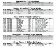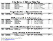 Premier Tour des qualifs Aaron Frankcomb (Aus) bt Shaun le Roux (Eng) 3-11, 12-10, 11-5 70 mins Joel Hinds (Eng) bt Sean Steinour ( local ) 11-5, 11-6, 11-4 16 mins