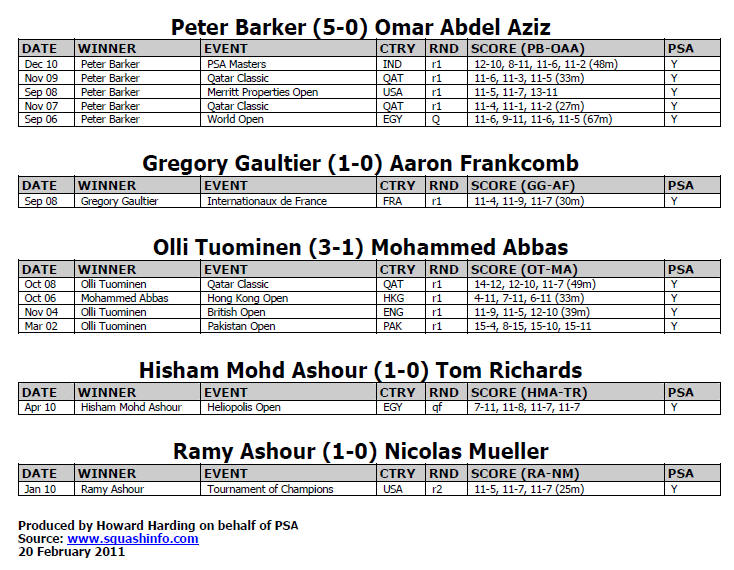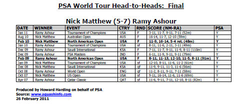 26 février 2011 - Finales : [1] Nick Matthew (Eng) bat [2] Ramy Ashour (Egy) 11/9, 11/5, 8/11, 8/11, 11/6 |