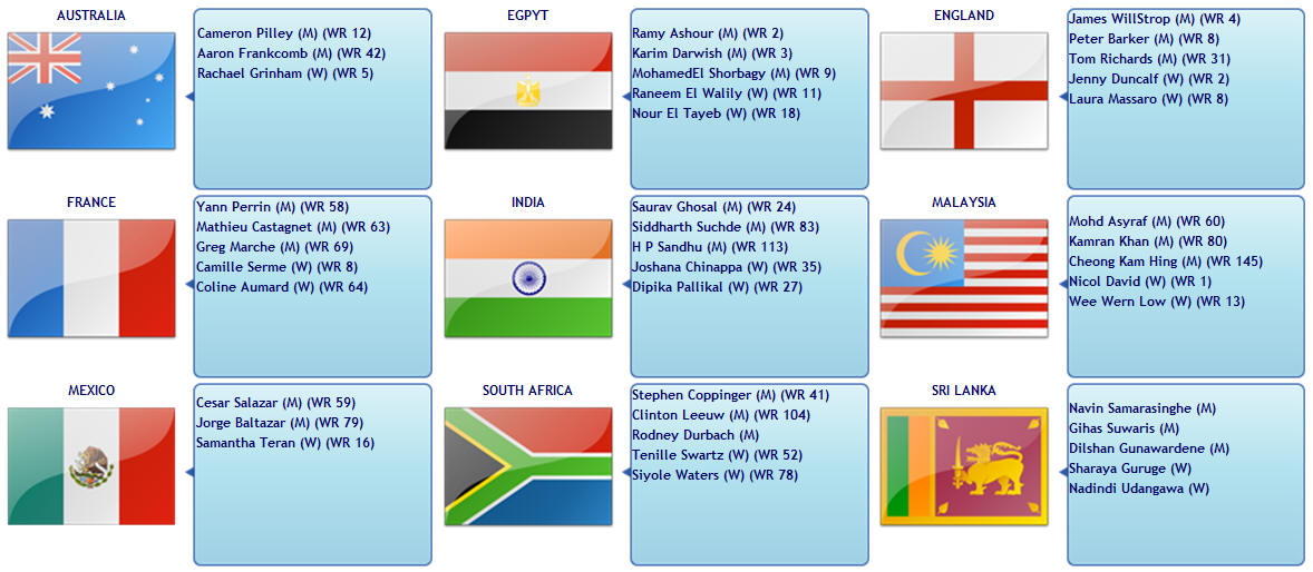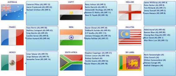 [3] AUSTRALIA bt [6] INDIA 3/0 Cameron Pilley 3-2 Saurav Ghosal 9-11,12-10,11-4,10-12,11-5 (72m) Rachael Grinham 3-0 Dipika Pallikal 11-3, 11-8, 11-4 (19m) Aaron Frankcomb 3-0 Harinder Pal Sandhu 11-9, 11-6, 11-9 (29m)