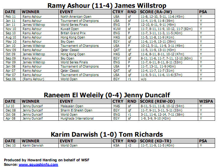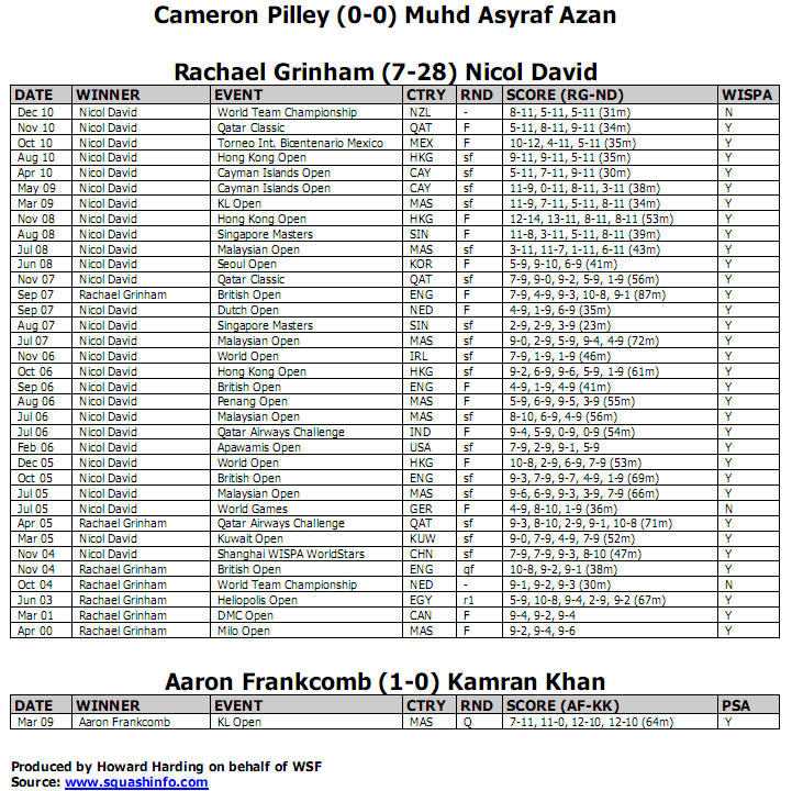 [2] ENGLAND v [3] AUSTRALIA James Willstrop bt Cameron Pilley 11-6, 11-7, 7-11, 12-10 (54m) Jenny Duncalf bt Rachael Grinham 11-5, 8-11, 11-4, 9-11, 11-9 (57m) Peter Barker bt Aaron Frankcomb 11-5, 11-6, 11-6 (43m)