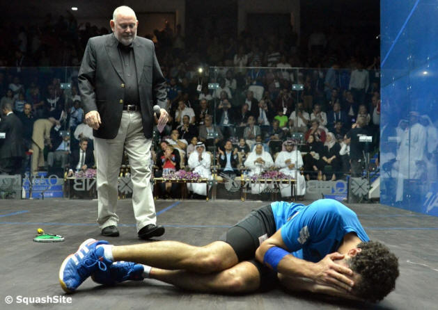 the final to Mohammed El Shorbagy, his racket arm troubling him,