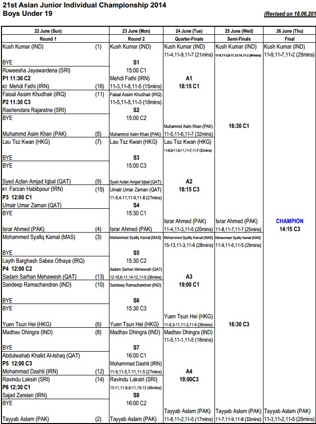 B19: [2] Tayyab Aslam (Pak) 3-2 [1] Kush Kumar (Ind)