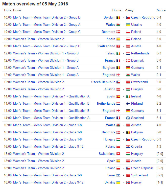 Spain 3/0, Czech Rep 3/0, Switzerland 2/1,