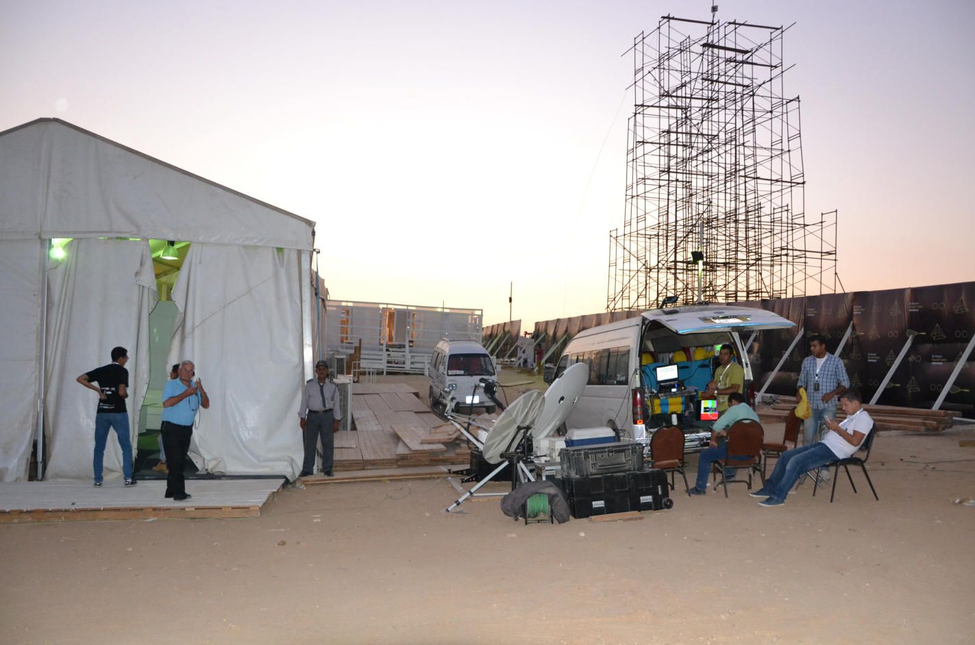 Between the TV van, some piece of wood laying on the ground and