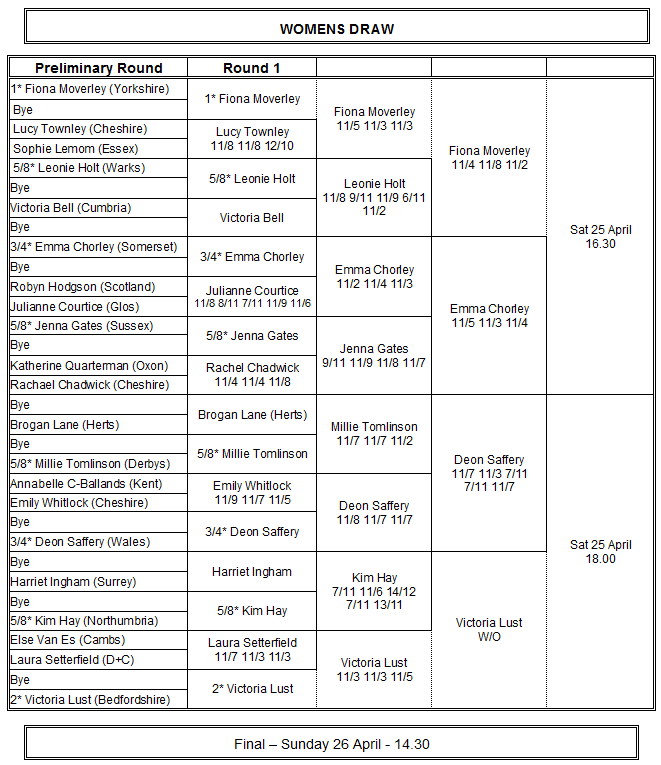 Niall Engerer (Essex) bt Lee Brownson (Cheshire) 11/6 4/11 11/4 13/11