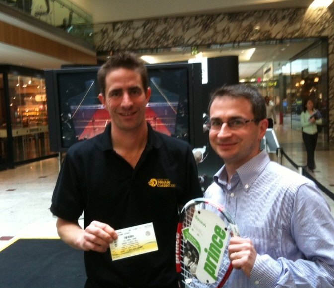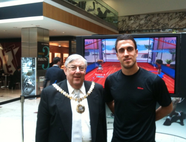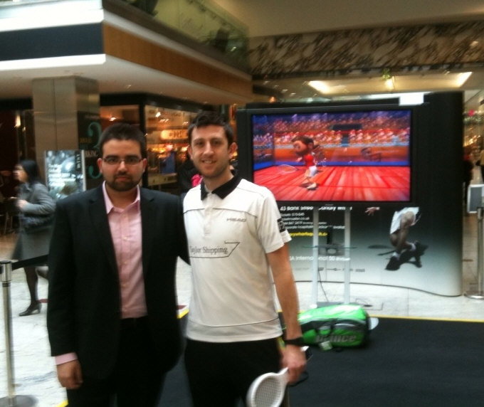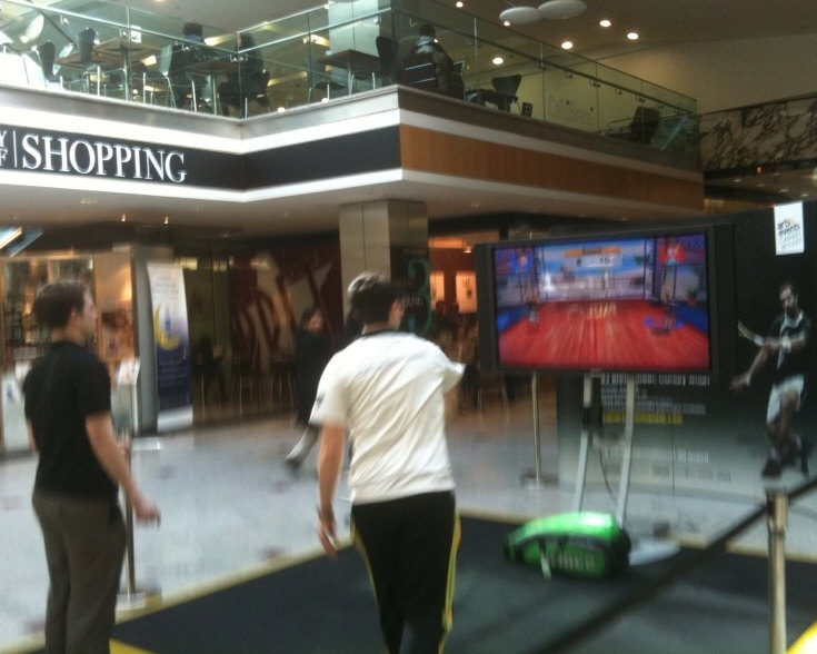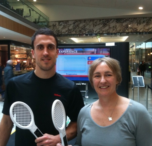 took on passers-by at Canary Wharf in the new Wii squash game.