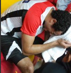 second when Ramy went forward for a ball, slipped and writhed in