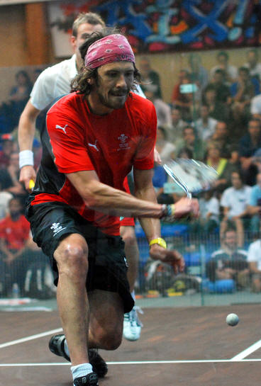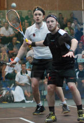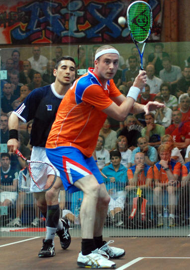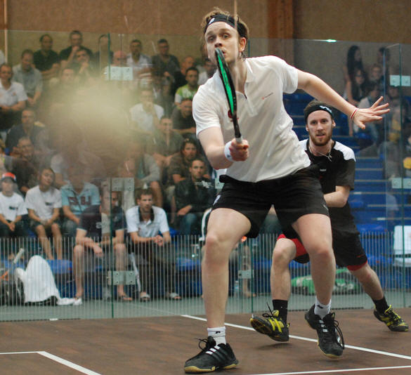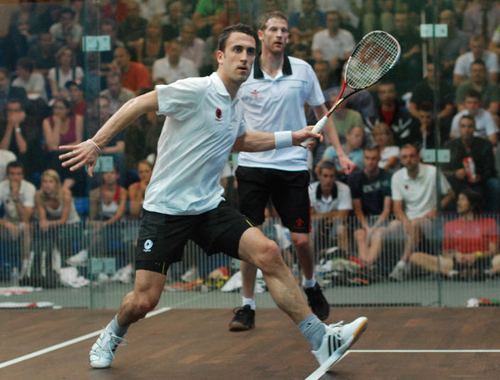 number two Nick Matthew on the glass court in front of a large
