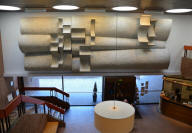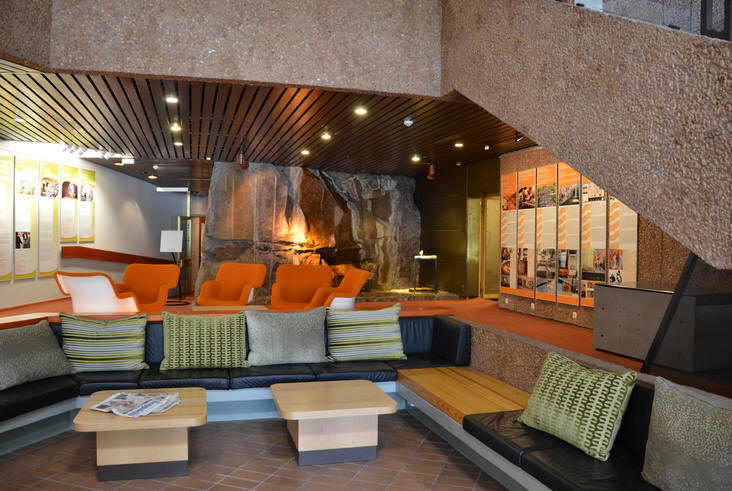 a modern, low, slightly sprawling vaguely circular building,