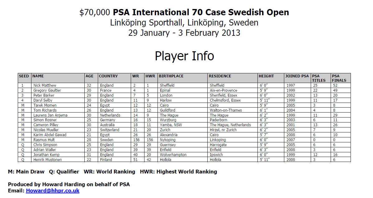 [1] Nick Matthew (Eng) bt Tarek Momen (Egy)